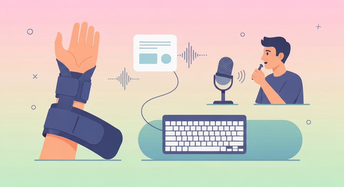 グッズで痛みを和らげつつ、AI音声入力でタイピング量を減らす。